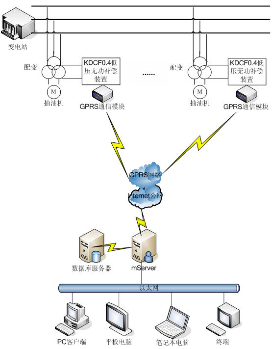 3.6 由于線路過長、抽油機工作地點遙遠并大都在山區,數據的采集和統計需要花費巨大的人力物力,并且實時性大打折扣。利用成熟的GPRS網絡,在設備端配置GPRS模塊,將數據方便、快捷上傳至數據服務平臺,并存儲到數據庫服務器,用戶可通過客戶端軟件進行遙測、遙控、遙信、遙調等功能。