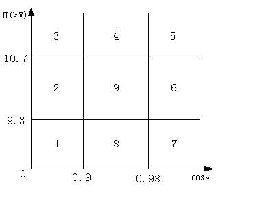 電壓無功綜合控制原理按系統(tǒng)電壓無功構(gòu)成的九區(qū)圖進(jìn)行控制,電壓上、下限可按GB12325-1990標(biāo)準(zhǔn)整定,以10kV為例,系統(tǒng)上限可為10.7kV,下限為9.3kV;無功以功率因數(shù)為判據(jù),按要求110kV變電站COSΦ應(yīng)不低于0.95,可為下限,上限為0.98,以不向系統(tǒng)倒無功為準(zhǔn)。無功(COSΦ)九區(qū)圖如下圖所示: