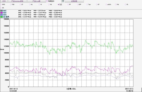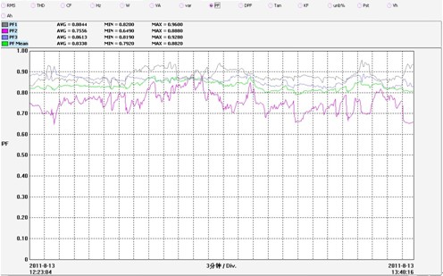 如下圖所示,無功功率主要在11.97Mvar上浮動,局部時間可達到13Mvar以上。功率因數主要在0.83上浮動。