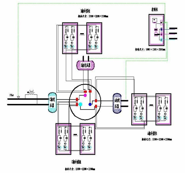 裝置安裝容量:2#電石爐變壓器額定輸出電壓主要分為三檔:140V、193V、240V,則低壓補償裝置額定電壓按 250V 取值為宜,則安裝容量為 25000kvar,取整定值 25200kvar,每個電極安裝容量為 8400kvar。因此實際補償容量15053kvar 的容量不會對礦熱爐系統過補償而導致無功倒送。結合昌鑫化工有限公司電爐變的情況,建議:無功補償降低的是接入點前的線路無功損耗,根據這一原理,針對電石爐低壓短網進行補償,使補償點上連接的無功補償裝置既能盡可能多的補償系統無功,同時要兼顧短網的合理接入,減少冶煉環境及操作維護等不利因素帶來的影響。 因此補償連接點選在短網末端的軟連接點上。電容柜安裝在三樓樓面。