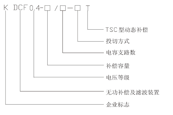 舉例說明:KDCF0.4-200/6-T 表明設(shè)備是標準柜式安裝補償裝置,總補償量200kvar,補償支路6路,采用晶閘管開關(guān)投切。